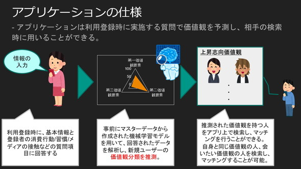 于是,在开发初期,他们从主办方提供的大量数据中提取了约60项内容,例如“爱好是什么”和“喜欢观看什么样的运动”,并通过应用称为主成分的统计处理将信息压缩为三个维度进行分析,这三个维度也就是“上进或稳定”“个人或群体”“工作或爱好”。