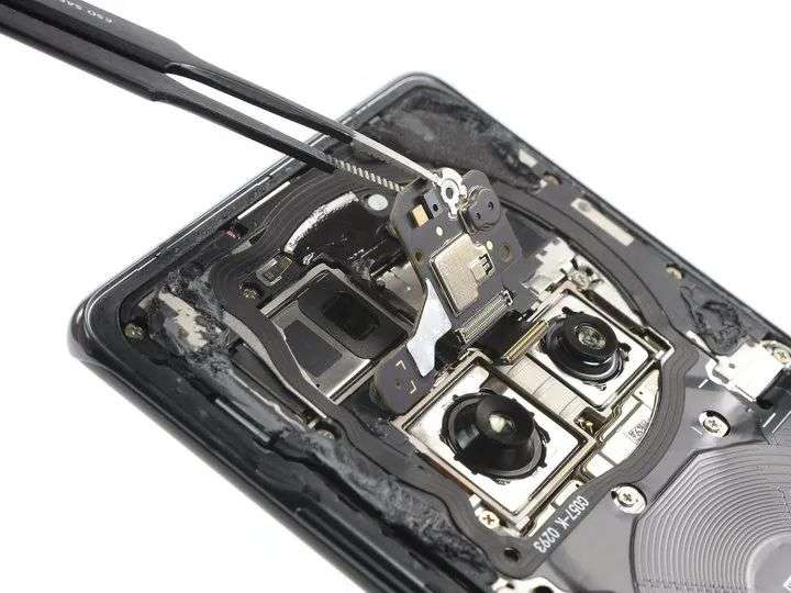 拆开 Mate 40 的背盖,可以一睹散布式设计的目的:由于各个摄像头的体积不一,尤其是潜望式模组的体积要大上不少,强行凑合在一起反而在外观上很难实现对称式的排布。
