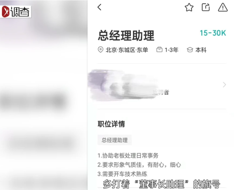 更最有意思的是,BOSS直聘审核制度下滋生了大量钻法律漏洞的“招聘者”,开启了色情招聘。去年,新京报发布题为《招聘网站里的情色陷阱:招助理实为“拉皮条”》的文章、揭露招聘平台BOSS 直聘上存在的招嫖乱象。有企业在BOSS直聘平台打着“董事长助理”“生活助理”的名义发布招聘信息,实为要求应聘者提供性服务。这令人不禁质疑,BOSS直聘在李文星事件后重金升级的监督审核机制是否已经有效提高了安全壁垒。